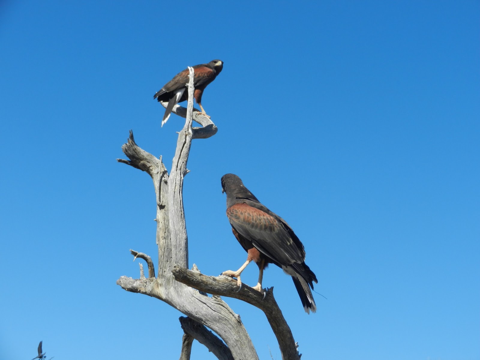 It was a beautiful ride and we were looking forward to seeing the Raptor Flight presentation at 2 p.m. We've heard from a number of people what a great show this was, and boy, they weren't wrong. We arrived about half an hour early and wound our way through the desert to the appointed spot. The narrator gave us some quick rules - from our hats down is "our space" from our hats up is the "birds space".....and a beautiful Grey Hawk came swooping down from the blue sky to land on a bare tree right next to me!