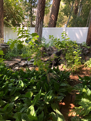 Their back yard is lush and beautiful with shady spots to sit and relax beside a burbling water feature beneath a thick grape arbor. We've enjoyed several meals outside on the deck once the sun dips behind the huge pines.